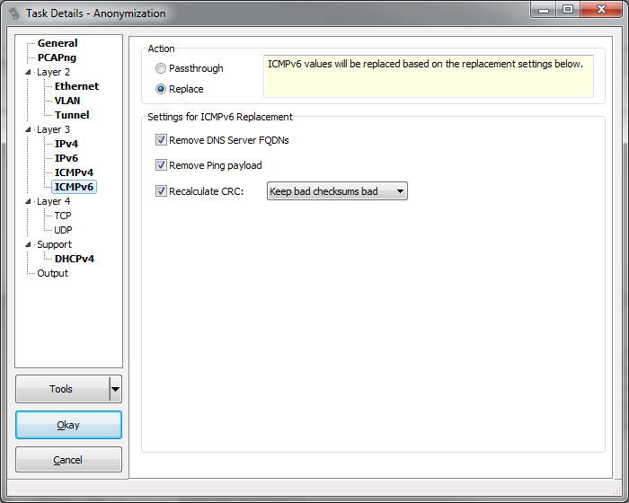 Recalculate CRC: this works just like the IPv4 setting. Since sanitization may lead to a modified ICMP layer, the CRC needs to be recalculated. But in case you want to keep bad checksums bad, TraceWrangler do it the same way as for IPv4.